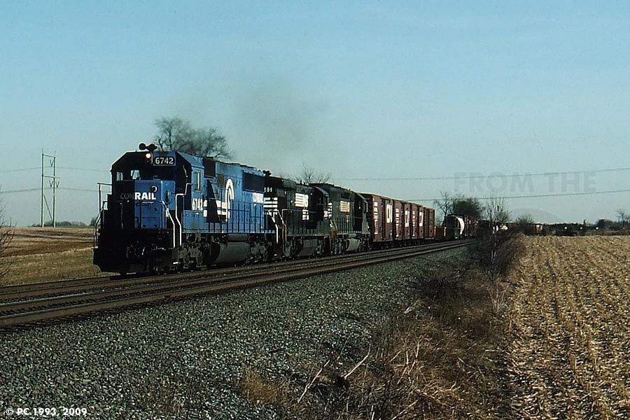 6742, NS 3980, and NS 1628 lead ALSR6 through Longswamp, PA on January 26th, 1993. This train became NS 155 at Hagerstown, MD.