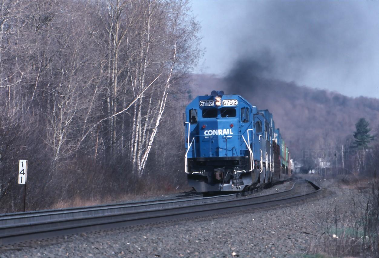 Still straining, the 6752 leads TV6 coming up on MP 141 in Hinsdale, MA. on April 29, 1992.