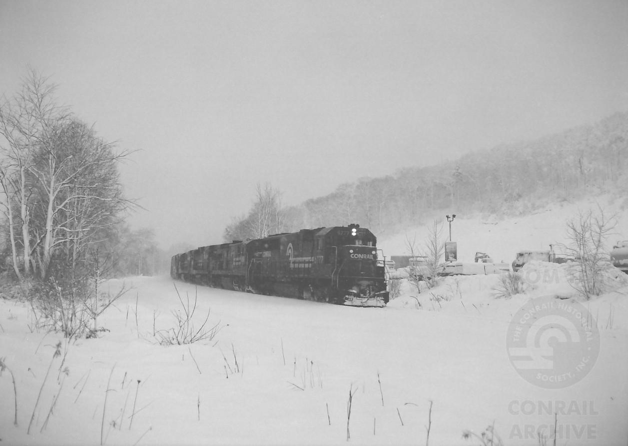 SD50 6777 with an unidentified eastbound at Flint's Crossing in Canaan, NY, on Dec. 12, 1992.
