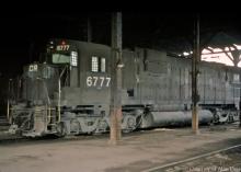 One of the Monsters of Mingo Junction, CR C630 6777 (ex-PC 6327), rests in the roundhouse in August, 1977.