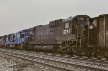 One of Alco's monster C636's, ex-PC 6788, follows CR U33C 6577 (ex-EL 3314) as they pull through Cresson, PA in March, 1978.