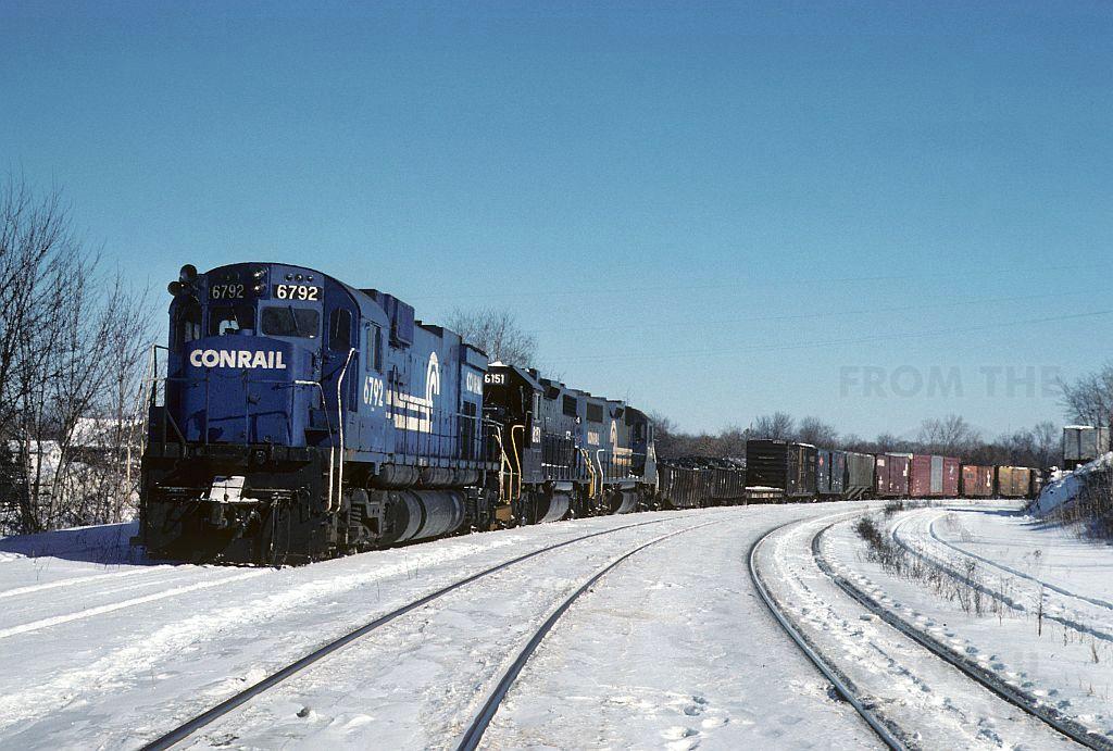 A westbound has pulled into the former EL yard in Kent, Ohio on a cold but sunny Feb 1979 day. Units 6792, 8151, and 7744 would spend most of the day here waiting on a rested crew. Big Alco C636 6792 has less than a year to go as an operating engine on Conrail, but she looks good this day in clean blue.