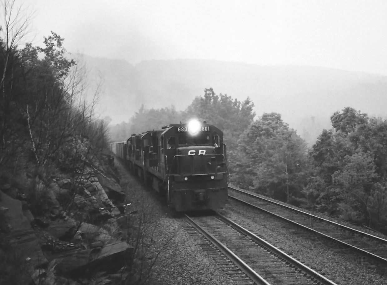 U25C 6801 leading westbound tonnage at MP 131 near Bancroft, MA. in June, 1979.