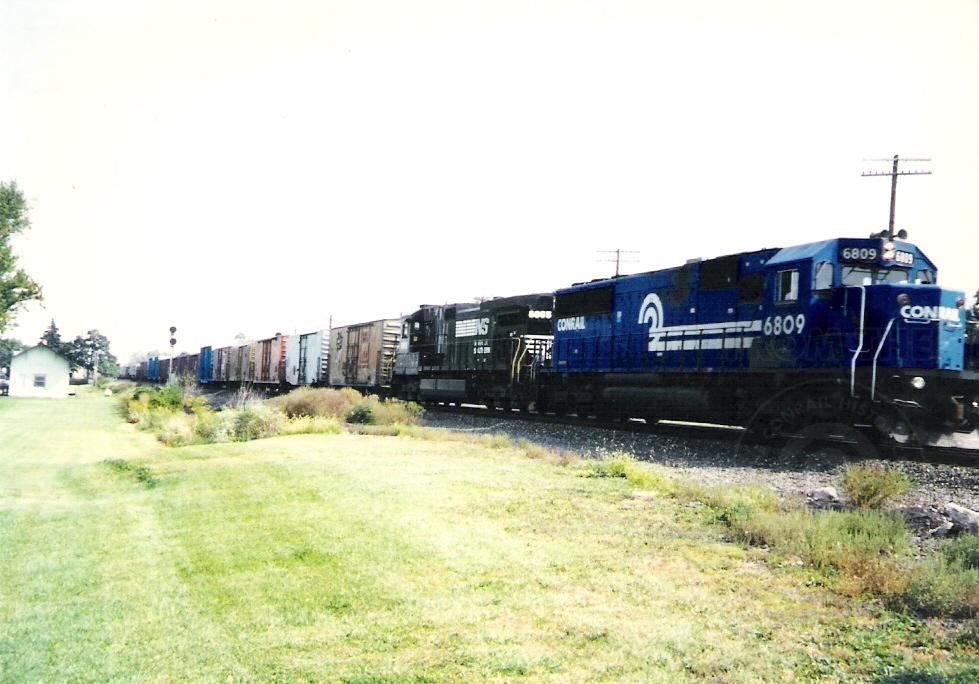 Conrail SD50 6809 and NS 8865 lead a westbound freight at Waterloo, IN back in 1995.