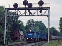 HBBU-8 is seen passing under the PRR signal bridge at McElhattan, PA behind SD50 6831, LMS C40-8W 703, SD40-2 6410 and SD40-2 6405. "The site of the old Rich tower would be close to the last unit on the left.. The old NYC had trackage rights starting here to access their old Beech Creek RR and to access Clearfield over the old PRR.."
