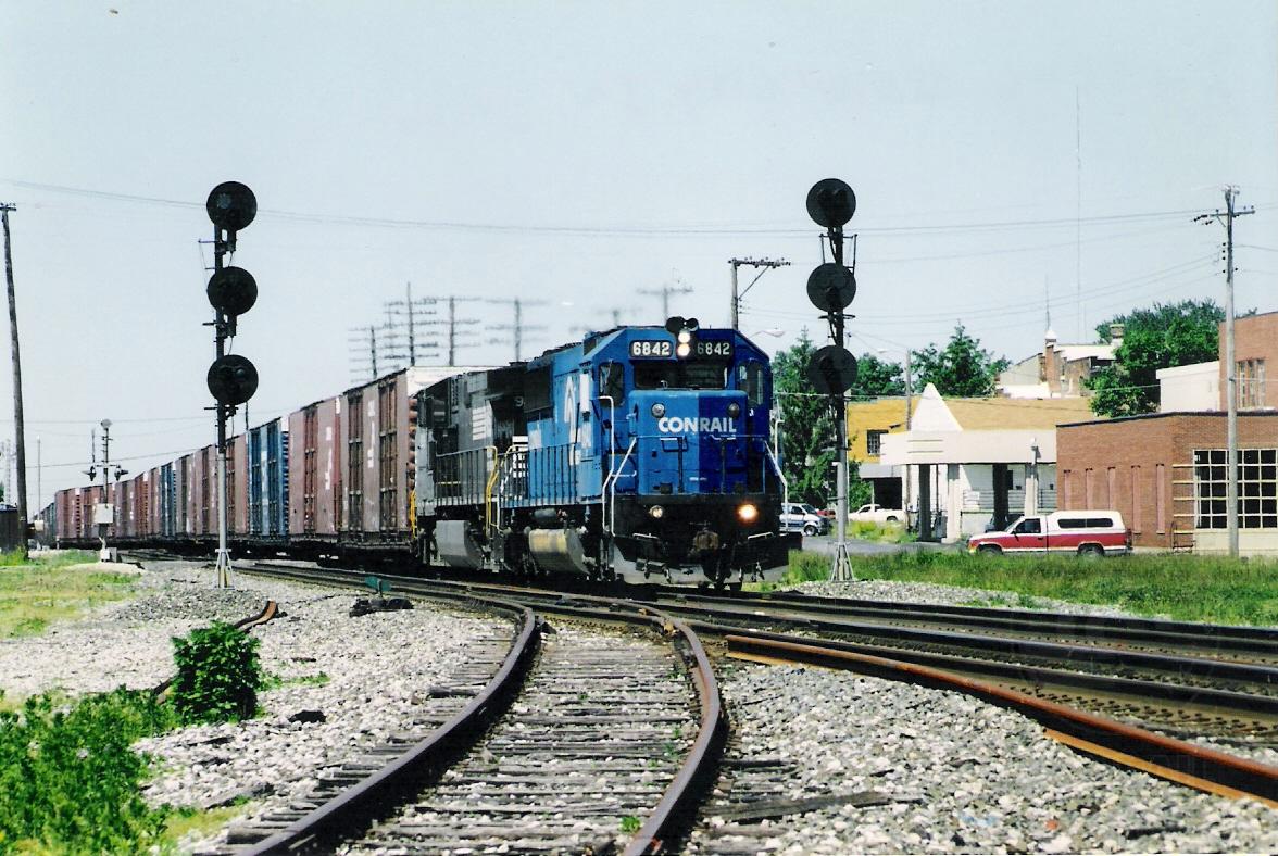 INTO-6 with the 6842 on the point at Union City, OH on May 27, 1999. This is one of the 3 ex EMD SD60 demonstrator engines that Conrail purchased outright.