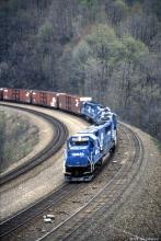 SD60 6849 and 3 other EMD products brings a train downgrade around Horseshoe Curve in 1990. We won't discuss how I got this particular photo angle.