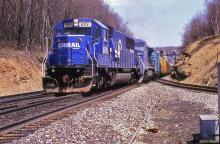 Conrail SD60 6851 is seen leading a westbound freight at Gallitzin, PA in 1993.