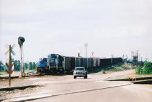 Conrail SD38 No. 6953 and MT4 No. 1018 shove the hump at Stanley Yard, Toledo, OH in August 1997. Doug Davidson photo with permission