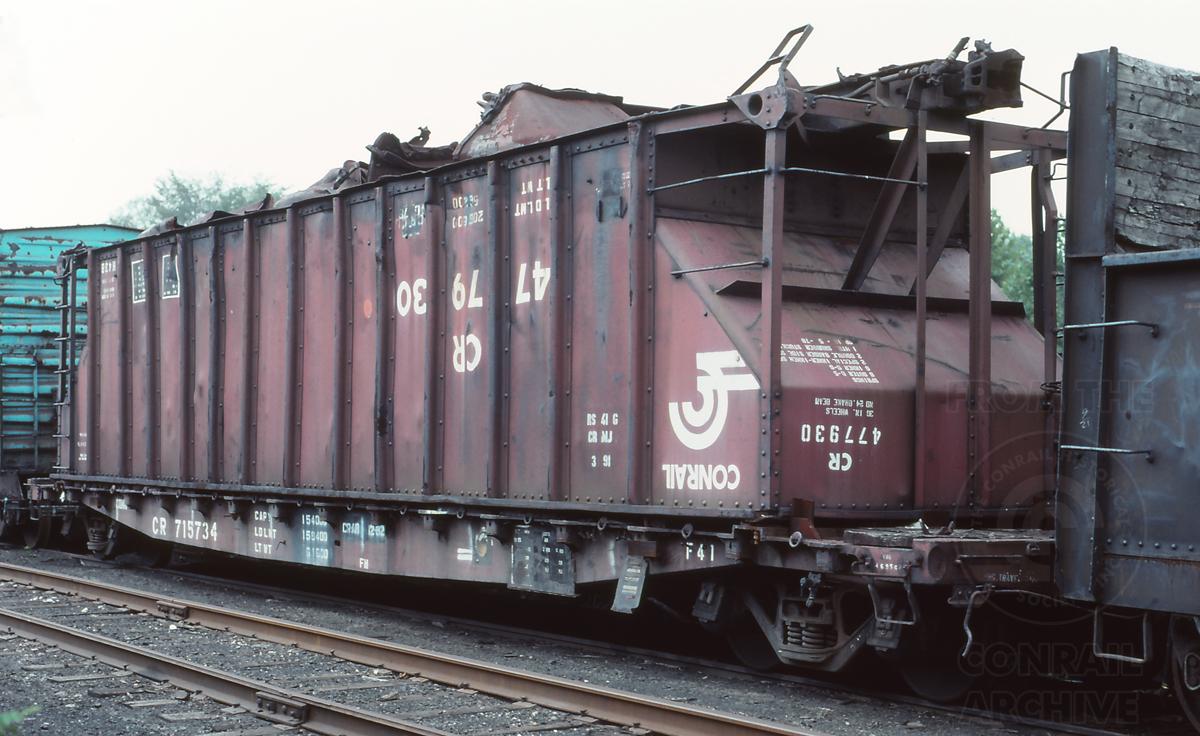CR 715734 (ex PRR 469568, built 12-55) is seen with wrecked CR 477930 (class H43B, ex PRR 228978, built 1-66) at Hollidaysburg, PA on 8/28/93.