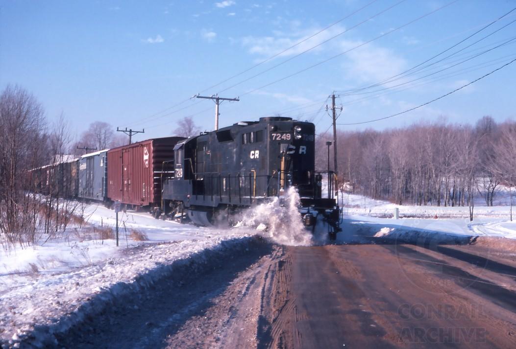 GP-9 7249 blows through snow berms at Risley's crossing with WNHA-20 on the Manchester secondary on Jan. 25, 1982