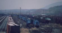 This April, 1992 view of the deadlines in Rose Yard shows GP9 7292 (ex-PC 7292) sitting among a sea of retired Geeps and EMD switchers, with the tracks behind them full of retired freight cars of every imaginable type.