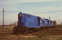 GP10 7535 leads a motley mix across the CNJ mains at Port Interlocking. The train is southbound on the Chemical Coast and soon Port and the mainline trackage would be history.