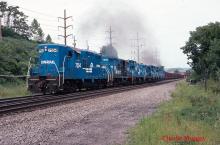 Might not be a picture perfect sky, but who would pass up three GP10's, three SW1500's and two SW900's on an empty Coalporter train at Wyomissing Jct. near Reading, PA. in September 1993. First two and last four are doing the work.