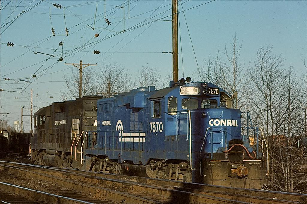 Late in the day, CR GP-10 7570 and GP-38 7756 rest at Morrisville in April, 1977.