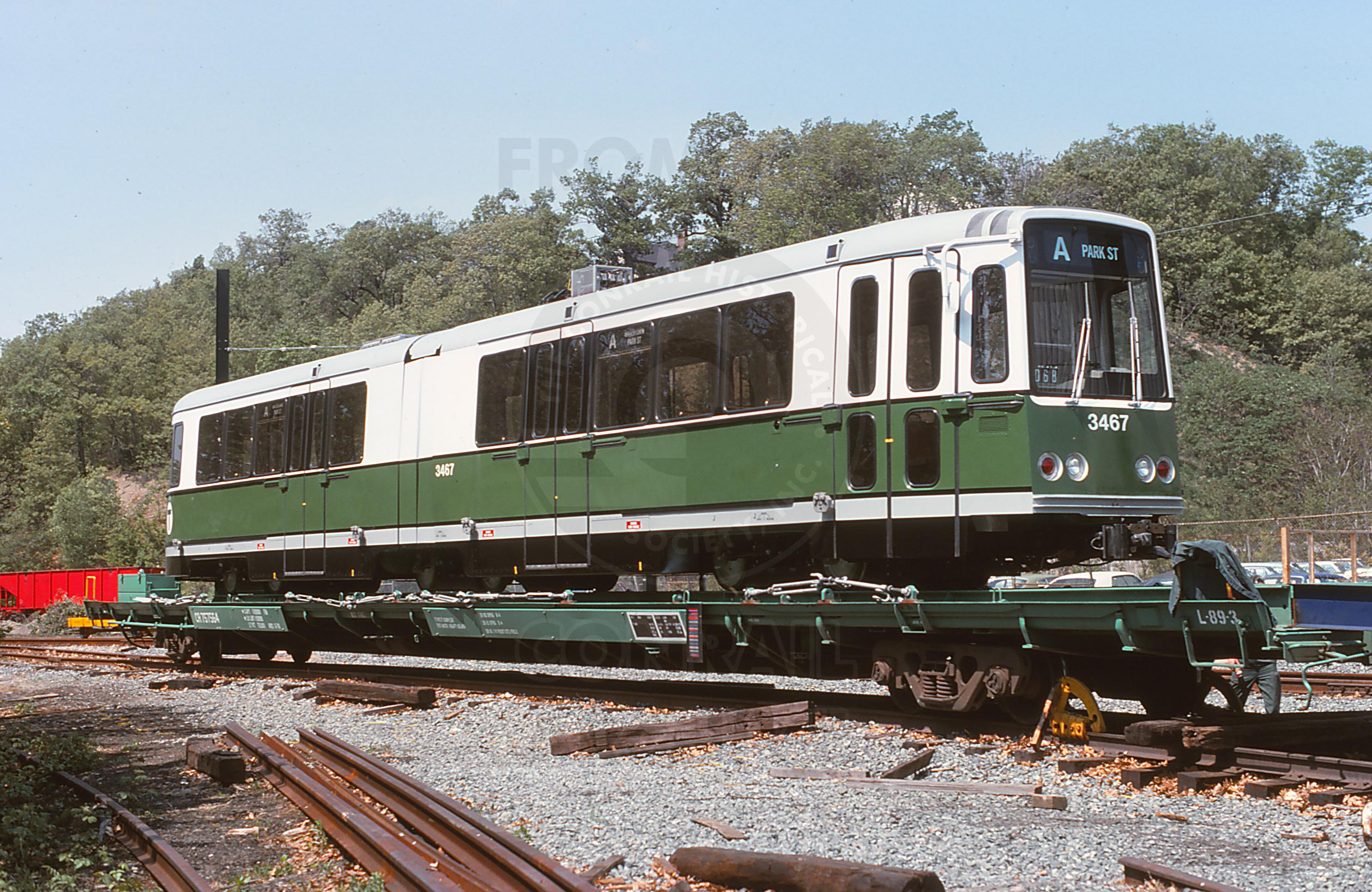 CR 757564 is seen loaded with MBTA 3467 at Riverside, MA on 5/17/77. Car is ex MDAX unknown, built 9-65 and was deleted by CR on 5/30/95.