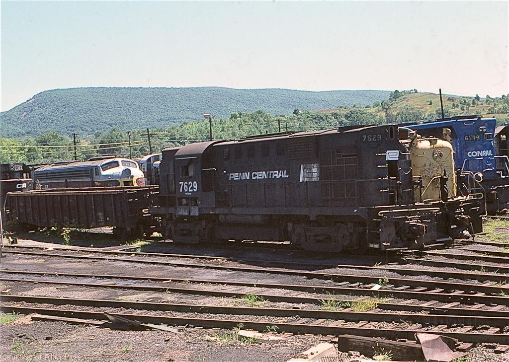 Parts removal has begun for former PC RS-11 7629 at the Juniata shops backshop in August, 1978, The Alco joins a number of units, including former EL RS-3's and an E-8A, CR blue SD-45 6119, and ex-PC GP-35 2363, also awaiting service or parts removal at the backshop.