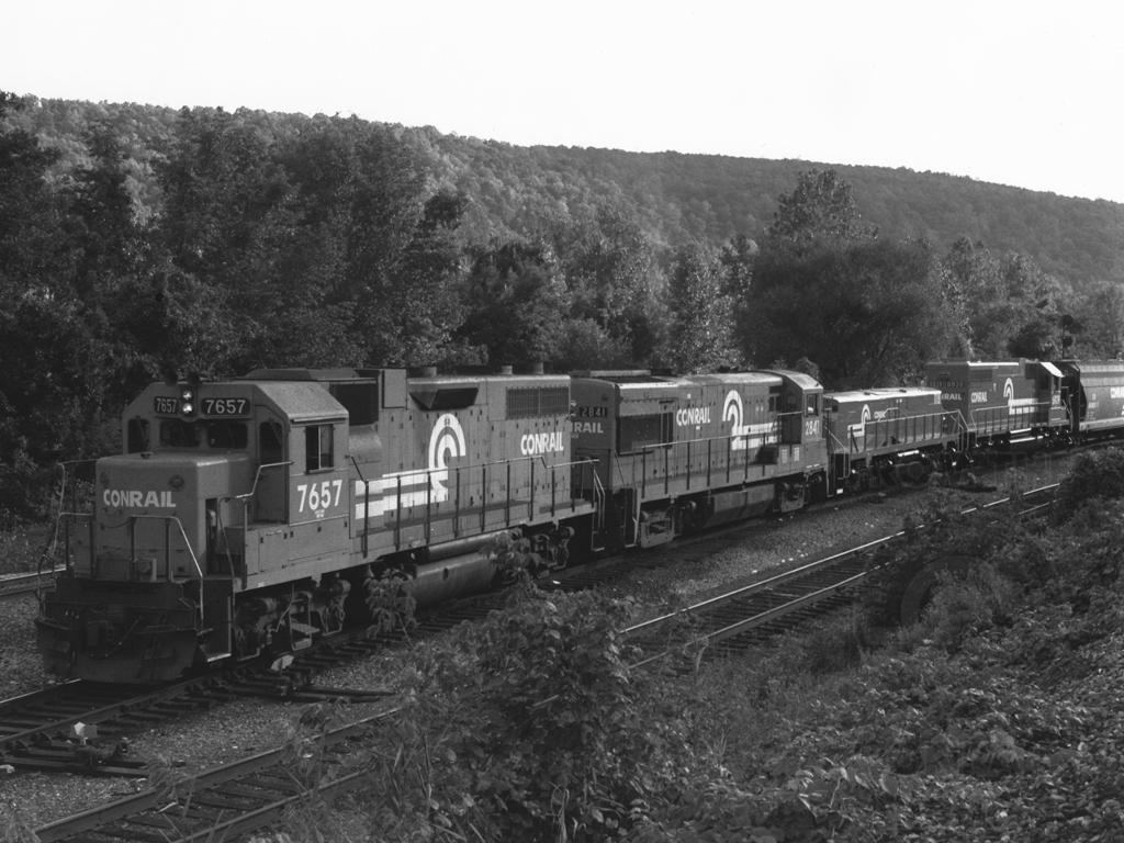 CR 7657 leads a freight at Allentown PA in the early 1980s. Note the freshly painted slug set in the consist.