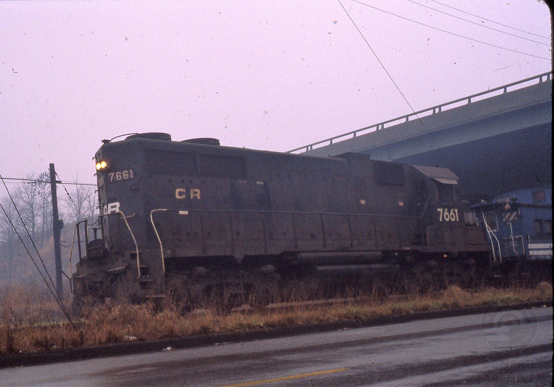Conrail GP38 7661 ex PRSL GP38 2001, long hood forward, in the rain, Mt. Laurel N.J. 12-2-81.