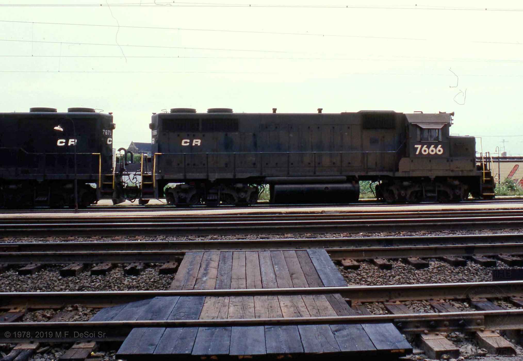 CR 7666 (Ex PRSL) leads a westbound through the station at Frankford Junction in Philadelphia, PA. July 1978