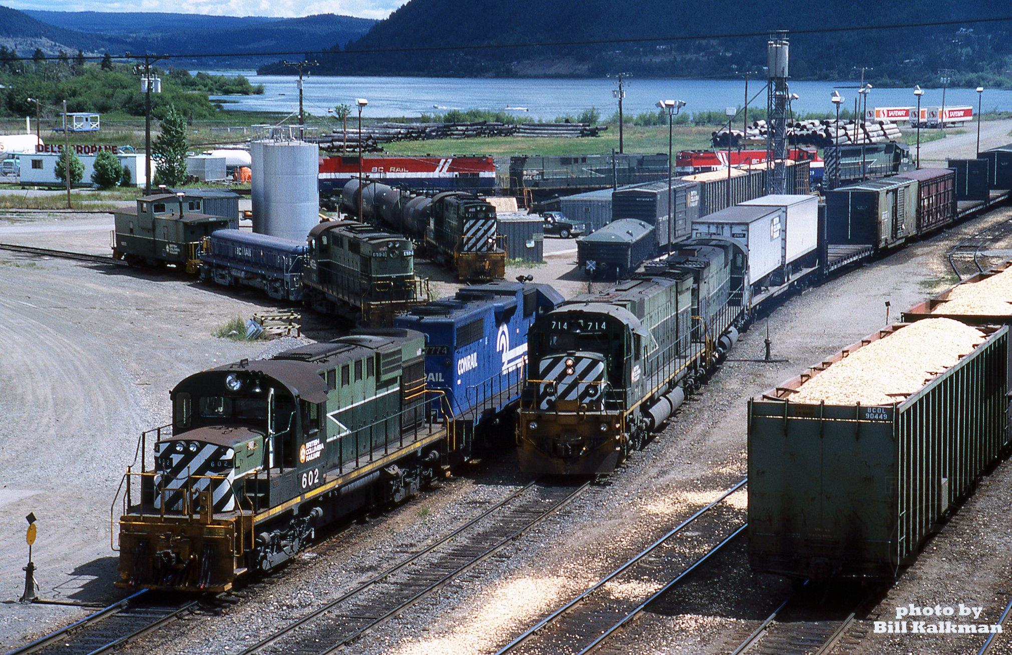 Conrail GP38-7774 is far from home rails, lost in a sea of green & red-white-blue British Columbia Railway diesels. Its coupled to BCR RS18-602 and will do some switching as soon as M630-714 gets out of the way. MId-afternoon on 7-6-86 in South Williams Lake, BC.