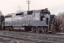 Former PC 7785 is seen at Rutherford, PA on 11/12/1983. Note the "CONRAIL" on the long hood rather than the usual "CR" and the odd numberboard font.