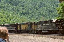 CR GP38 7866 leads CNW GP30 821, U23B 2742, and CNW GP-30 812 down Horseshoe Curve on May 22, 1977.