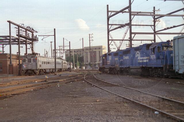 An inbound SEPTA Doylestown local pauses for a station stop as the Conrail local with GP38-2 CR 7874 and 7875 sits on Yard Track 2 in Lansdale.