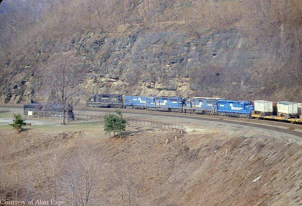 CR SD-40-2 6378 (1977-built) leads GP-38 7910 and SD-45 6177 racing piggybacks up track 2 past a mixed freight at Horseshoe Curve in March, 1981.