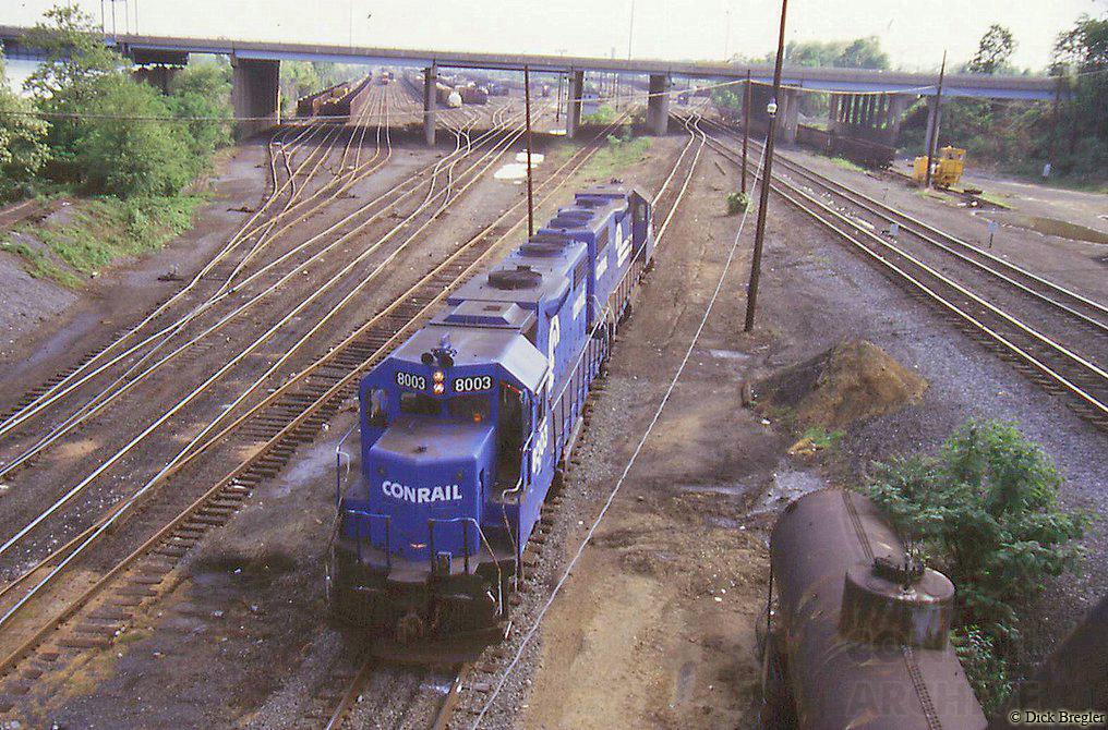 Conrail GP38-2 8003 is seen at Overview from the old Iron Bridge in 1986.