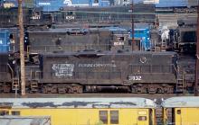 Former PC GP38-2 8086 rests behind GP9B 3832 in lines of power at the Enola engine terminal in August, 1979,