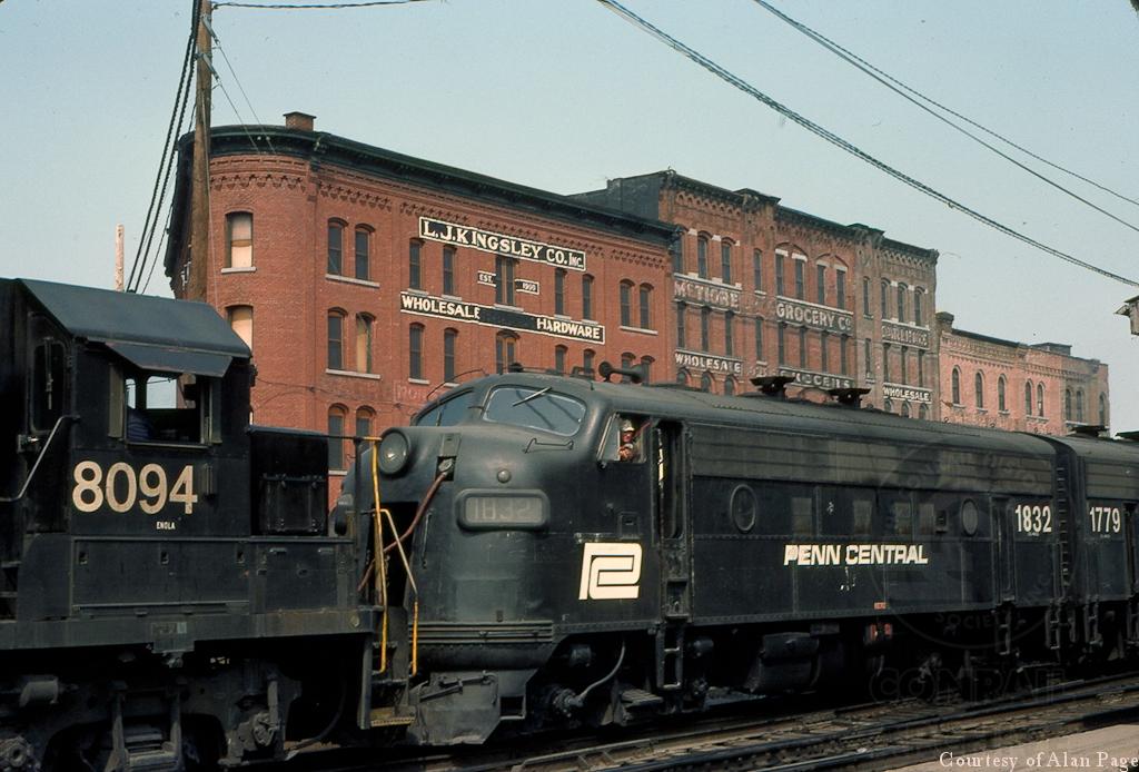 PC GP38-2 8094 leads former NYC F-units 1832 and 1779 as they rush autoracks through Binghamton, NY in April, 1977.