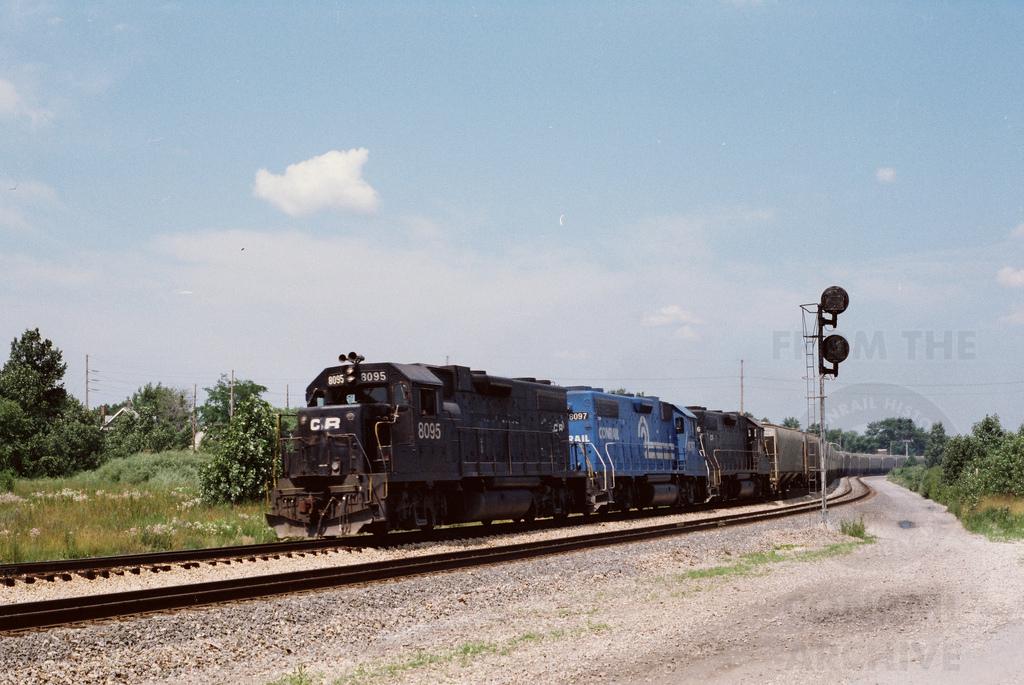 This eastbound Conrail freight with 8095 leading has diverged from the former PRR route at Lake Junction(now CP 505) and is now swinging onto the former New York Central alignment at Whiting, IN. June 1982. Conrail severed the PRR main line through East Chicago about 1980. After that date, all eastbound trains (except local moves to the Whiting refinery) diverged off of the PRR at Lake Jct and took the former NYC alignment through East Chicago. On the west side of Gary, at CP 501, the Broadway Limited (and any other train) could diverge from the Chicago Line and return to the PRR route at Clarke Jct. Doug Davidson photo with permission