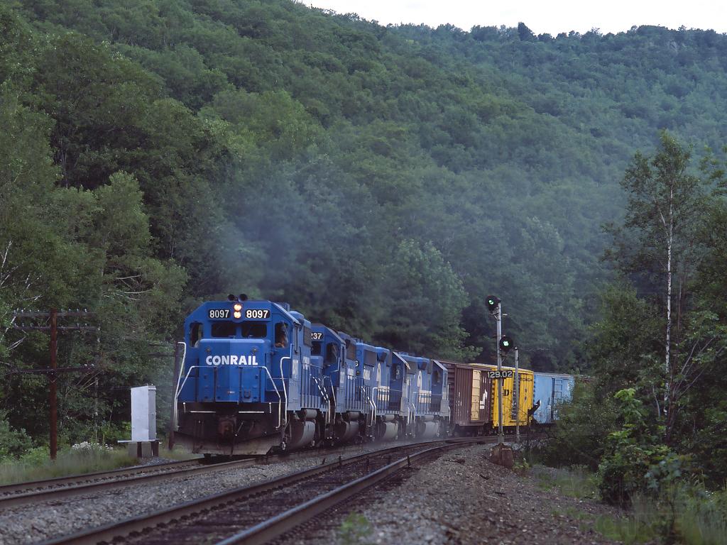 Westbound RESE rounding the horseshoe curve nearing MP 129 in Becket, MA. on July 23, 1982. Note the dragging equipment detector and mast for the indicator light just behind and to the right of the signal.