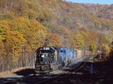 CR 8111 leads westbound RISE past MP 129 in Becket, MA. on Oct. 17, 1981.