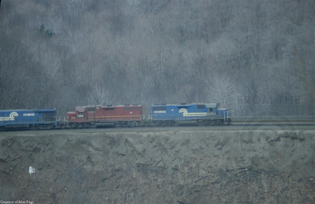 CR GP-38-2 8251 leads GP38AC 7656 (ex-LV 310) and a U-boat down Horseshoe Curve in April, 1981.
