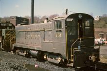 Ironton 751 Baldwin DS4-4-1000 (CR 8354) sits on the ready track with former RDG GP39-2 3410 (D&H 7410) at Bethlehem in April, 1977.