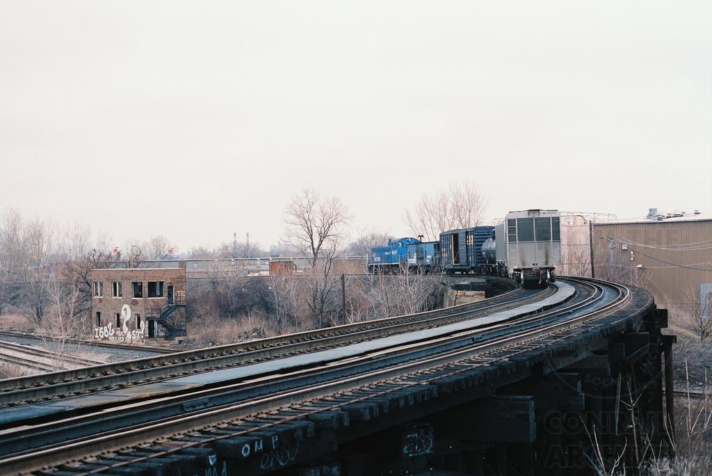 A Conrail local freight is seen on the ramp at 49th Street returning to Ashland Avenue Yard in March 1992. The former B&OCT 49th Street Tower is but a shell by this date. The ramp was former Chicago River & Indiana track that is also used by GTW intermodal trains to reach Railport Yard. The double track below is CSX's Blue Island Subdivision, and the far track is the remains of the former PRR Panhandle Line. Conrail uses this track to service an elevator at 51st Street. Doug Davidson photo with permission