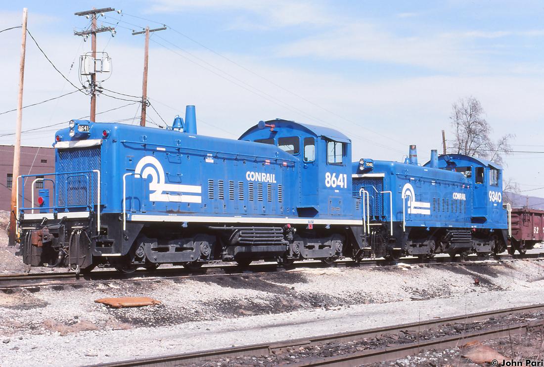 Former PC 8641/NYC 9641 is seen with SW1200 CR 9340 at Hollidaysburg, PA on 3/9/1991. The 8641 would later become MDDE 801 and be one of the few to be painted in the "Conrail Express" paint scheme.
