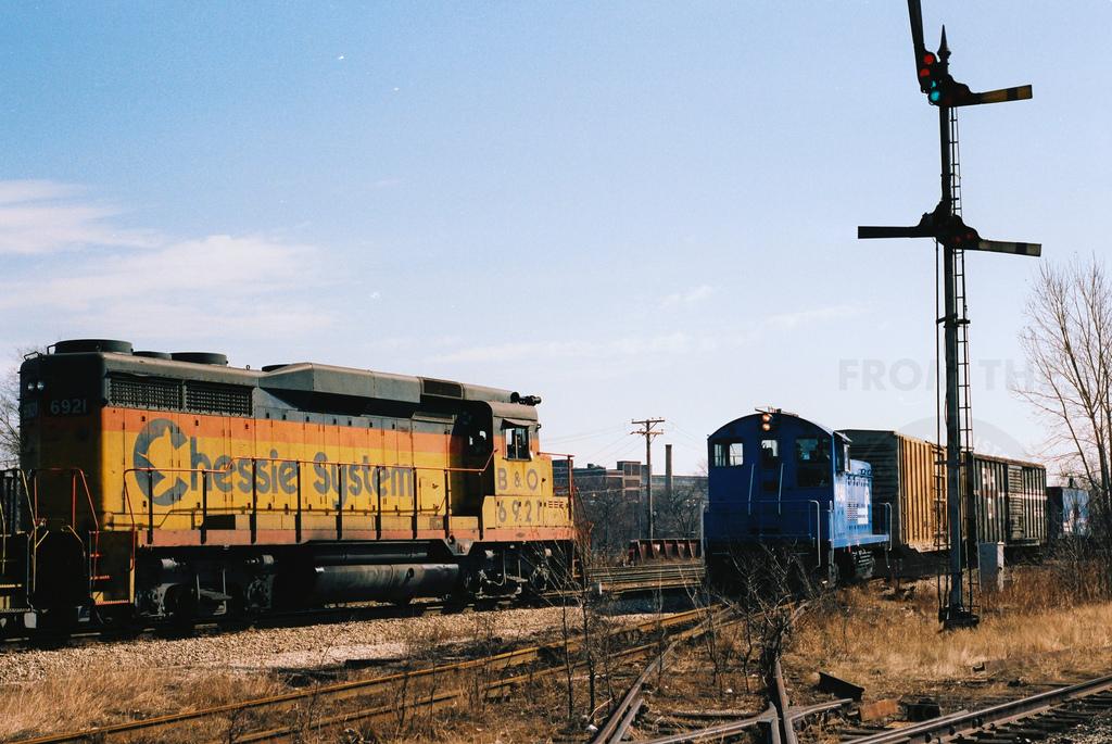 B&O GP30 No. 6921 holds short of the Panhandle Connection at 37th Street while a Conrail local freight led by 8646 crosses from the CJ to the Panhandle Line in April 1987. Check out those classic semaphore signals! Doug Davidson photo with permission