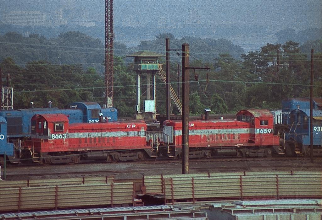 Previous Next Former Raritan River SW900's 8659 and 8663 lined up CR blue power at Enola in February, 1986. Photo By Alan Page Year 1983 Original Date 9/5/83 Location City Enola PA Location Details Enola yard Equipment Type EMD SW900 Conrail Number 8659 8663 Collection CRHS Conrail Photo Archive Contributions