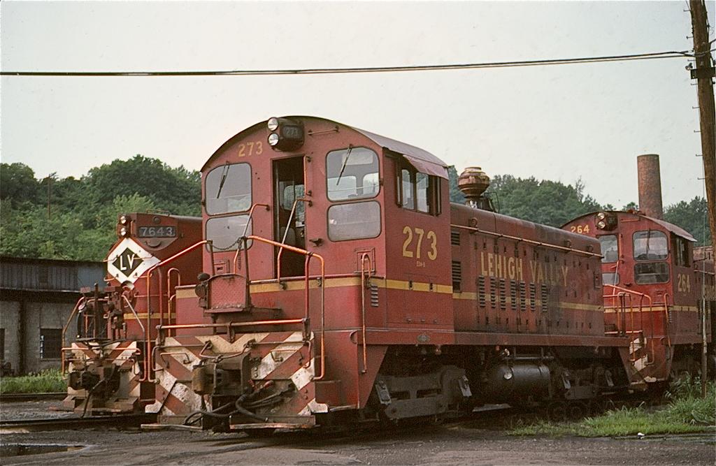 All LV SW-8's 273 and 264, and RS-11 7643, outside the Bethlehem roundhouse in August, 1977.