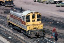 Two trainmen appear to be having a heated discussion as former EL SW8 No. 368 switches the yard. Binghamton, NY. 4/10/76.