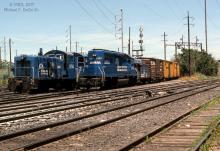 Conrail SW900 #8714 with a local and SD40 #6374 shoving a train at CP Nice in Philadelphia, PA. July 17, 1983
