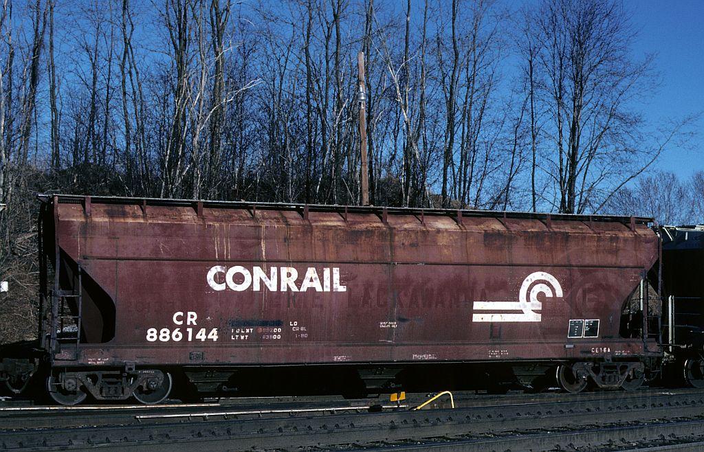 The ghost of the Erie Lackawanna is visible on this Conrail covered hopper. A close look will even reveal it's ex EL number of 20133, an ACF product built in 1968. The large EL diamond logo is also showing on the right section of this car. Cresson, Pa January, 1999.