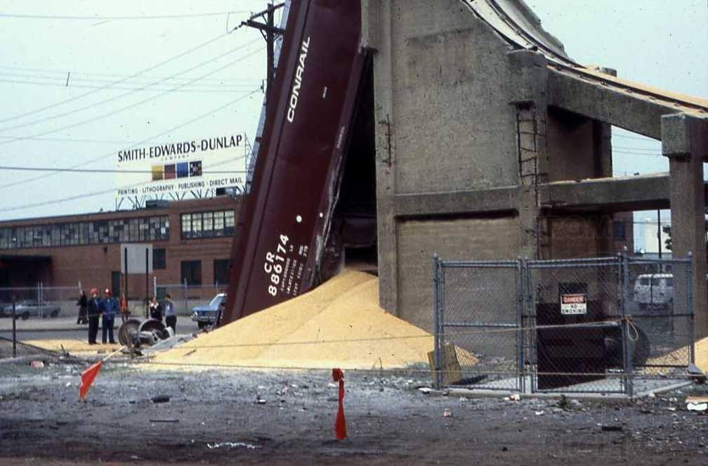 OOPS!!! Conrail covered hopper #886174 lays on its end, spilling grain all over the place, Port Richmond Graino, Philadelphia, Pa Date unknown (late 1970's or early 1980's). For a view of this complex in an earlier era, check out this 1927 photo from the Hagley collection. The kickback ramp where this photo is from is over on the far right.