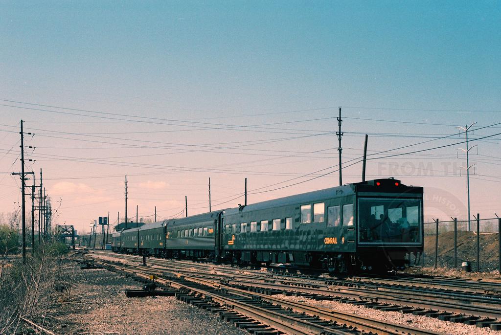 Conrail's Office Car Special is seen operating westbound on the IHB at Argo, as theater car CR 9 passes by in April 1986. Its destination is the Chrysler Plant at Belvidere, IL, located on the C&NW. Doug Davidson photo with permission