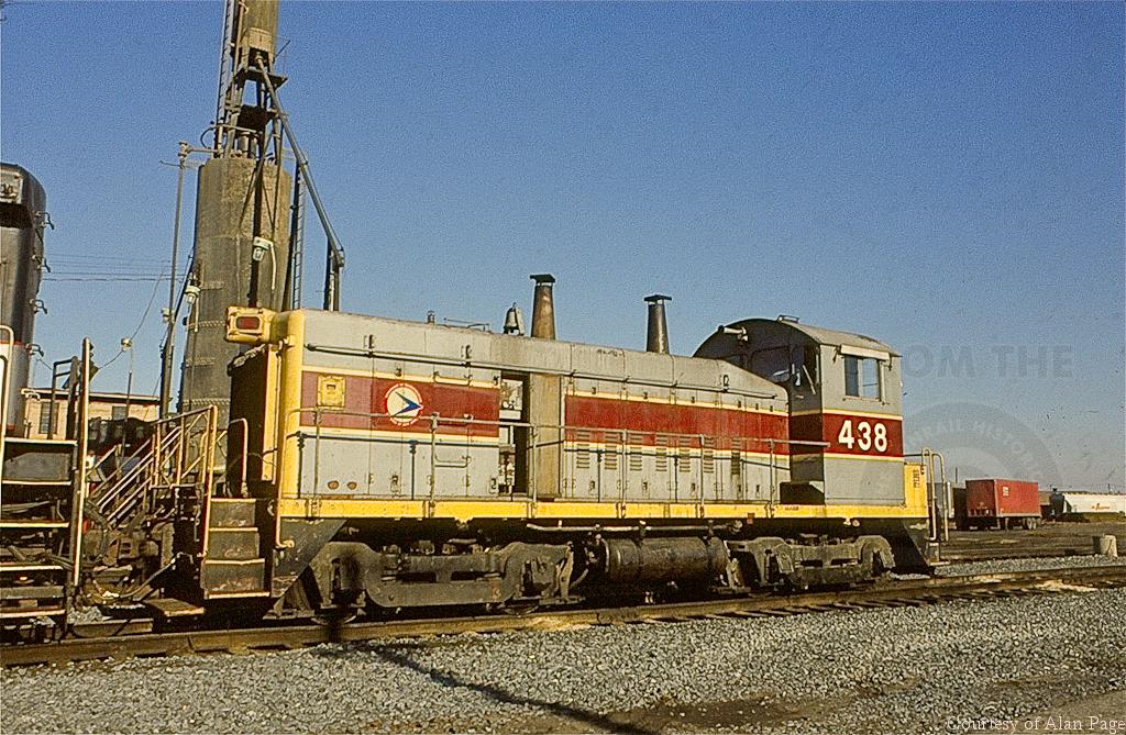 To support CR-operated commuter operations in NJ, CR lettered former EL SW-9 438 as NJDOT 438 rather than 9014 for the CR roster. The former EL SW-9 waits in the service line at Elizabethport, NJ in November, 1978. The April, 1952-built SW-9 served NJDOT until transferred to NJ Transit following cessation of CR-operated passenger operations on January 1, 1983. The ancient SW-9 survives as part of the United Rairoad Historical Society museum roster after donation by NJ Transit in 1995.