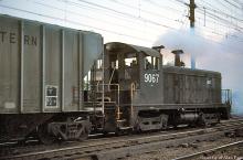 Ex-PC SW7 9067 smokes up Morrisville yard in April, 1977.