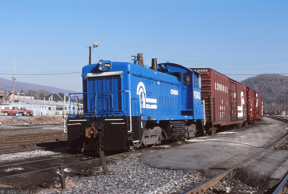 Former PC 9024/PRR 9024/PRR 7924 is coupled to some insulated boxcars near the shops at Hollidaysburg, PA on 1/11/1986.